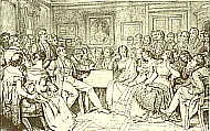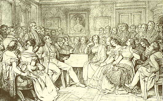 Franz Grillparzer, 1791- 1872, rechts vor dem Kamin stehend abgebildet, berühmter österreichischer Dramatiker, wohnte oftmals Schubertiaden bei.